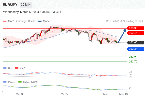 欧元/日元 当日内: 有上涨的可能,目标价位定在 163.38 。