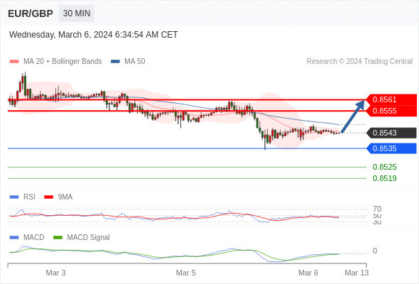 欧元/英镑 当日内: 有上涨的可能,目标价位定在 0.8561 。