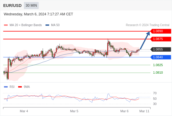 在 1.0840 之上,看涨,目标价位为 1.0875 ,然后为 1.0890 。