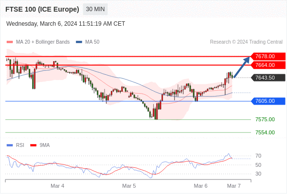 在 7605.00 之上,看涨,目标价位为 7664.00 ,然后为 7678.00 。