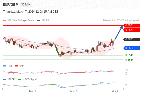 欧元/英镑 当日内: 看涨,当 0.8550 为支撑位。