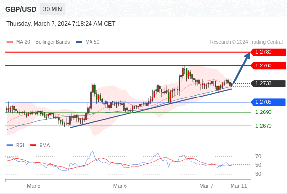 在 1.2705 之上,看涨,目标价位为 1.2760 ,然后为 1.2780 。