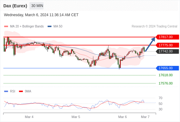 在 17655.00 之上,看涨,目标价位为 17775.00 ,然后为 17817.00 。