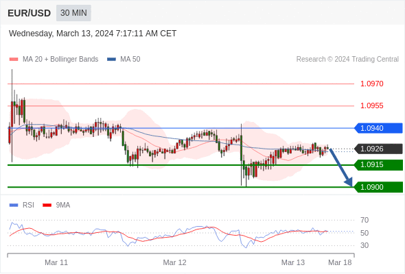 欧元/美元 当日内: 短期关键阻力位在1.0940。
