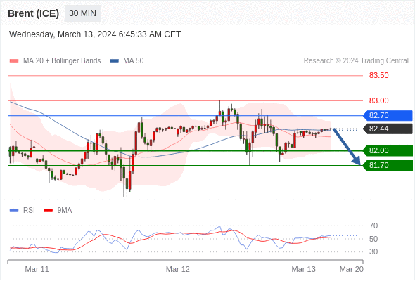 布伦特原油 (ICE)? (K4)? 当日内: 短期关键阻力位在82.70。
