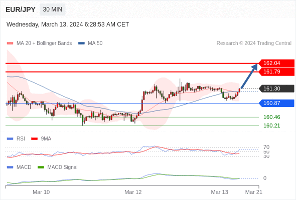 欧元/日元 当日内: 看涨,当 160.87 未被跌破。