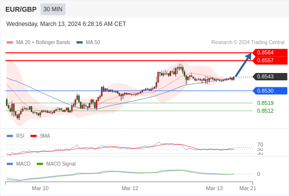 欧元/英镑 当日内: 看涨,当 0.8530 为支撑位。