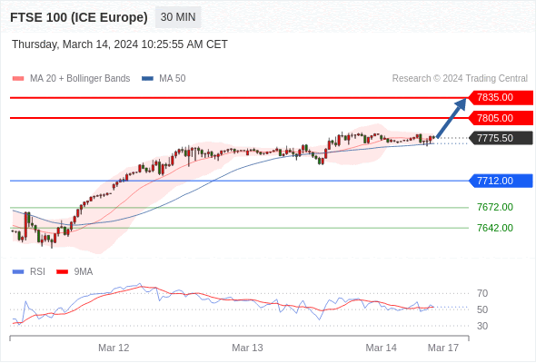 在 7712.00 之上,看涨,目标价位为 7805.00 ,然后为 7835.00 。