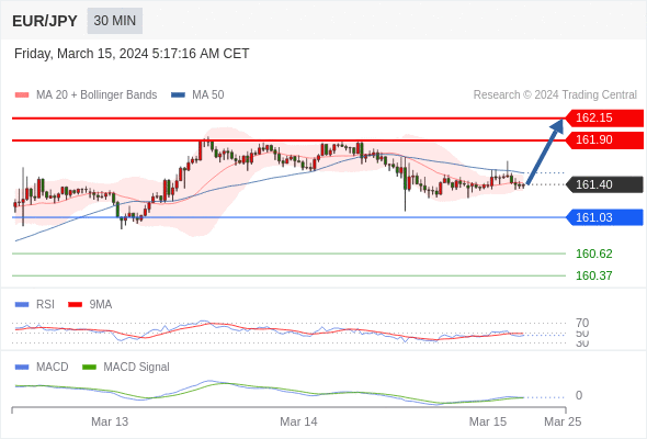 欧元/日元 当日内: 有上涨的可能,目标价位定在 162.15 。
