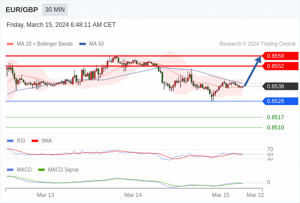 欧元/英镑 当日内: 有上涨的可能,目标价位定在 0.8559 。