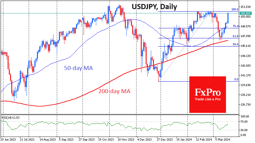 有趣的是,市场的反应是,在上周开始加息的同时,日元也在贬值。美元兑日元在消息公布后上涨了约1%,同时较上周的低点上涨了2%,很难被认为是买入-卖出-事实的反应。在目前的150.50的水平上,它已经接近2月份的高点,几乎抵消了所有有关加息猜测的涨幅。