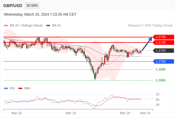 在 1.2700 之上,看涨,目标价位为 1.2735 ,然后为 1.2745 。