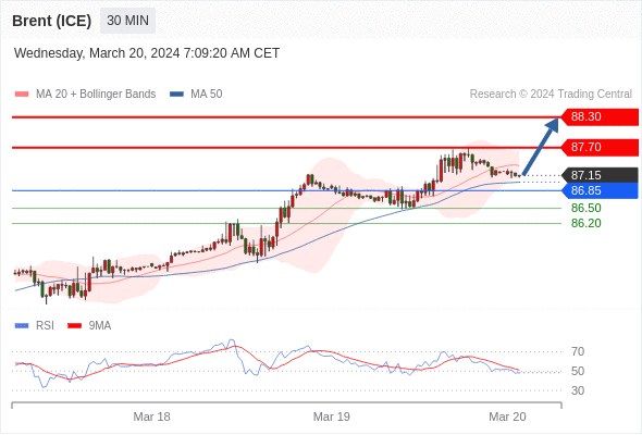 在 86.85 之上,看涨,目标价位为 87.70 ,然后为 88.30 。