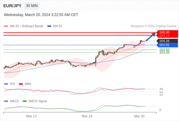 欧元/日元 当日内: 看涨,当 163.91 为支撑位。