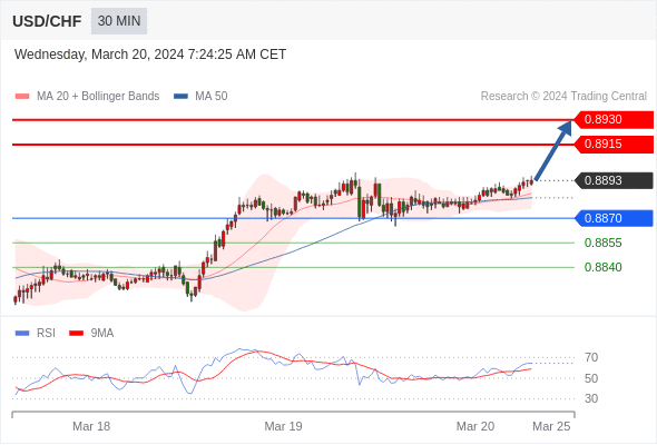 在 0.8870 之上,看涨,目标价位为 0.8915 ,然后为 0.8930 。