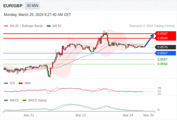 RSI技术指标低于50。 MACD技术指标处在其信号线之上 看空。 此外,价位低于其20天及50天移动平均线 ( 分别位于 0.8578 和 0.8581 )。
