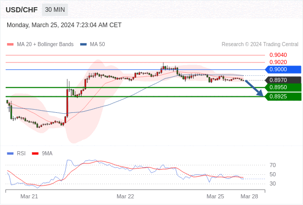 美元/瑞郎 当日内: 短期关键阻力位在0.9000。