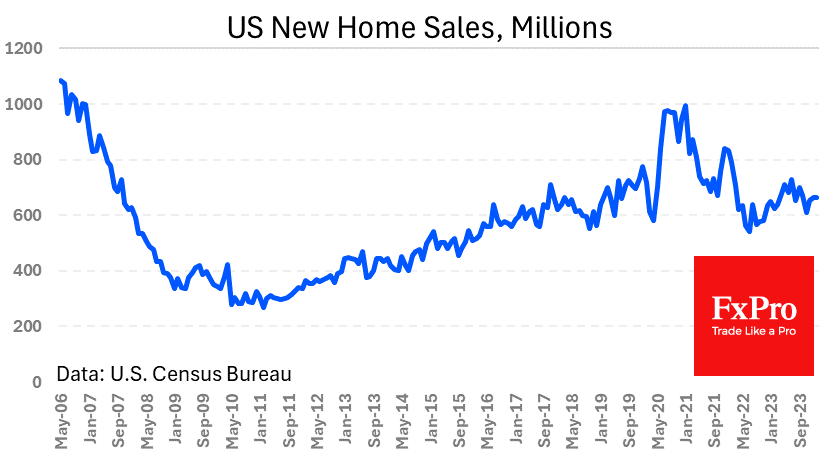 FxPro高级分析师Alex Kuptsikevich指出:也许唯一能提醒人们美联储利率接近几十年来高点的是价格下跌。2月份,中位数销售价格下跌3.5%至400.5万美元,为2021年6月以来的最低水平,比2022年10月496.8万美元的峰值低近20%。新房价格从2007年的峰值到2009年的低谷的跌幅也大致相同。