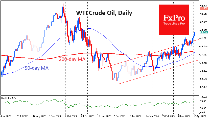 FxPro高级分析师Alex Kuptsikevich指出:在某种程度上,石油正在设法效仿黄金。自上周初以来,黄金的买盘也在稳步增加。最近的涨势也可以归因于中国经济加速的迹象,以及美国持续强劲的制造业数据,这预示着能源需求的增加。