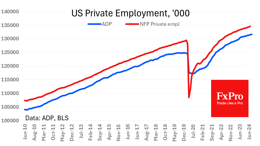 FxPro高级分析师Alex Kuptsikevich指出:ADP报告3月份的预测显示,私营部门就业人数增加了18.4万,是2023年7月以来最高值,高于预期的15万。在对新闻发布的评论中,ADP的首席经济学家指出,不仅工资压力普遍增加(与通胀降温形成对比),而且还有一系列涨幅最大的行业:建筑业、金融服务和制造业。