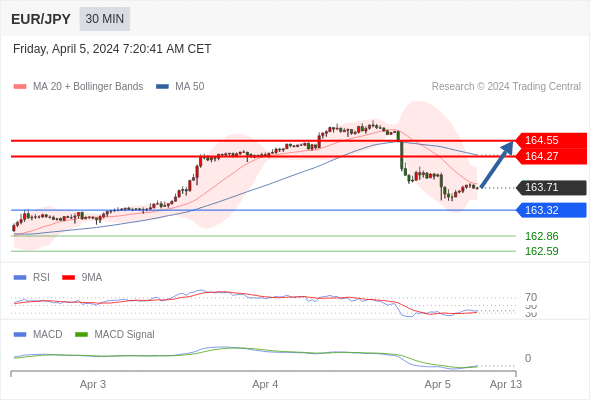 欧元/日元 当日内: 有上涨的可能,目标价位定在 164.55 。