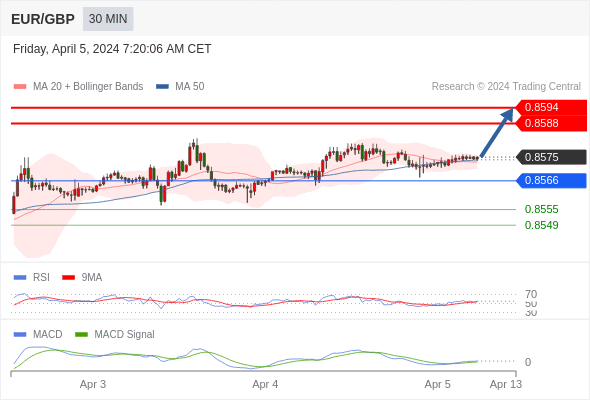 欧元/英镑 当日内: 看涨,当 0.8566 为支撑位。