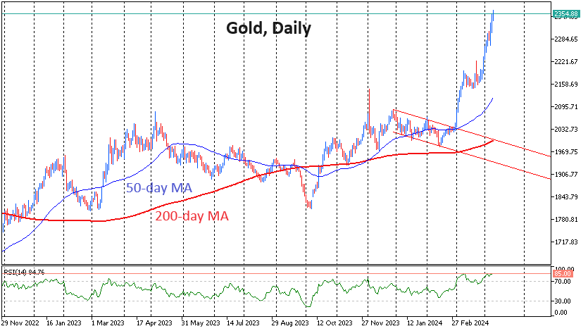 与此同时,根据RSI指数,黄金在每日和每周的时间框架都被超买,达到了2020年8月初以来的最高水平。当时,8周的上涨之后又出现了数月的回落。