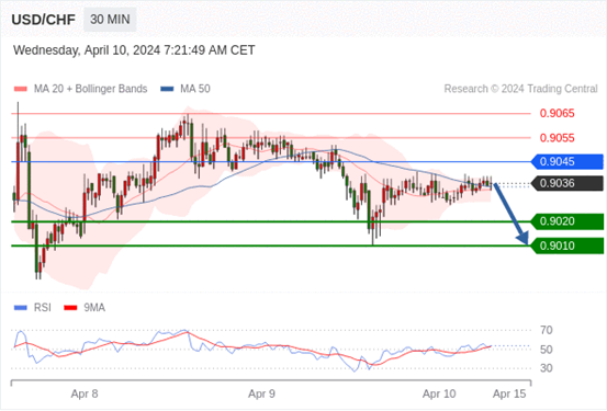 在 0.9045 之下,看跌,目标价位为 0.9020 ,然后为 0.9010 。