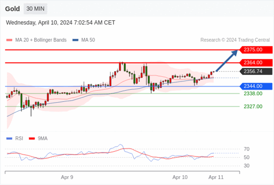 在 2344.00 之上,看涨,目标价位为 2364.00 ,然后为 2375.00 。