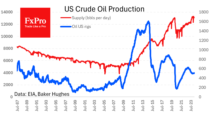 其次,供需平衡是在牛市一方。欧洲的经济增长仍在增长,美国没有放缓,尽管最近油价上涨,但石油供应并不急于扩大。过去五周,美国的日产量为1310万桶,石油钻井平台数量刚刚超过500个,今年迄今事实上停滞不前。