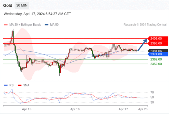在 2374.00 之上,看涨,目标价位为 2398.00 ,然后为 2409.00 。