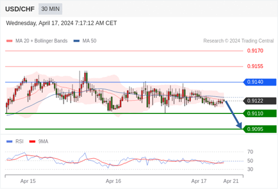 在 0.9140 之下,看跌,目标价位为 0.9110 ,然后为 0.9095 。