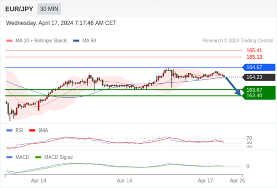 欧元/日元 当日内: 看跌,当 164.67 为阻力位。
