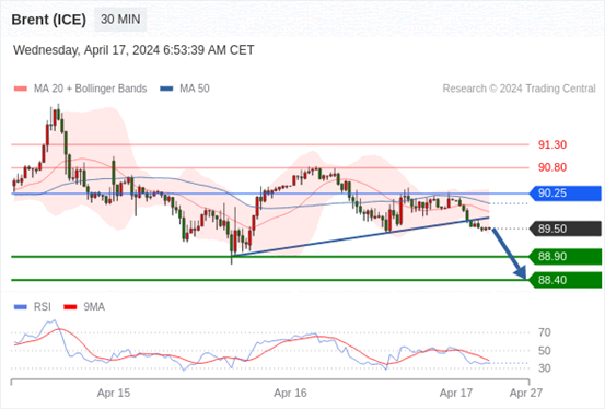 在 90.25 之下,看跌,目标价位为 88.90 ,然后为 88.40 。