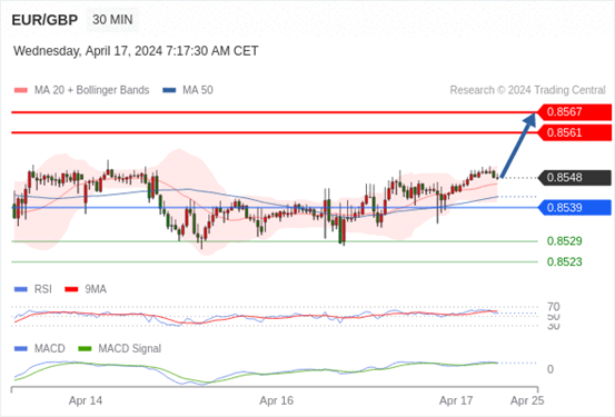 RSI技术指标超过50。 MACD技术指标呈现看多状态并 处在其信号线的上方。 此外,价位处在其20天及50天移动平均线上方 ( 当前是 0.8546 和 0.8542 )。