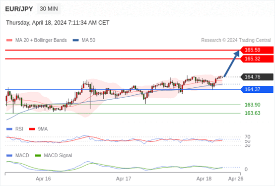 欧元/日元 当日内: 看涨,当 164.37 为支撑位。
