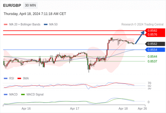 欧元/英镑 当日内: 看涨,当 0.8554 为支撑位,目标定在0.8582。