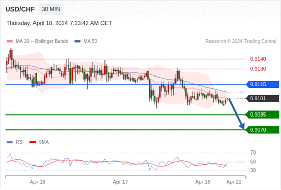 在 0.9115 之下,看跌,目标价位为 0.9085 ,然后为 0.9070 。