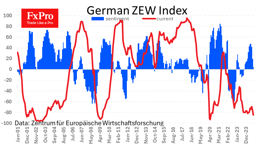 根据ZEW数据显示,德国9月份的商业情绪急剧恶化。相关指数跌至3.6,这是自2023年10月以来的最低水平。评估当前状况的分项指标情况更为糟糕,跌至-84.5,这是2020年以来的最低点,接近历史低点。