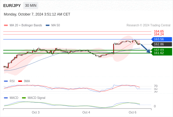 欧元/日元 当日内: 逐渐下跌,当 163.56 阻碍上行,则 161.62 为目标位。