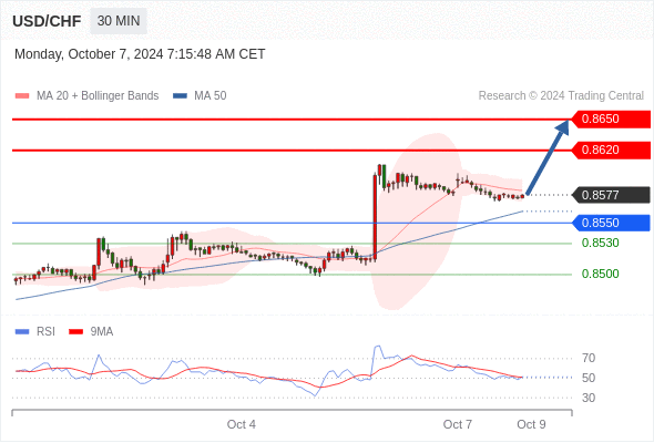在 0.8550 之上,看涨,目标价位为 0.8620 ,然后为 0.8650 。