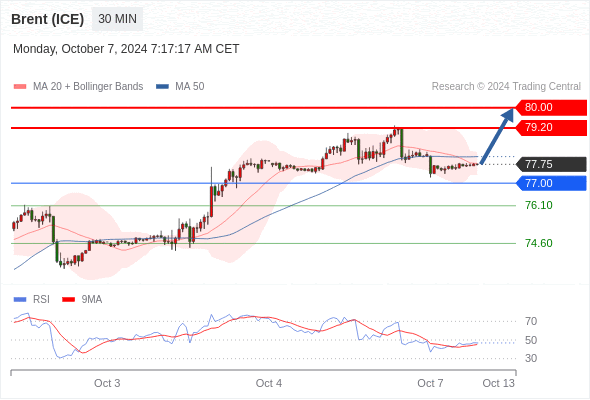 在 77.00 之上,看涨,目标价位为 79.20 ,然后为 80.00 。