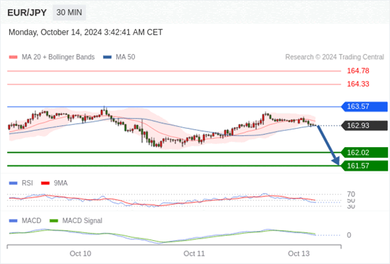 欧元/日元 当日内: 逐渐下跌,当 163.57 阻碍上行,则 161.57 为目标位。
