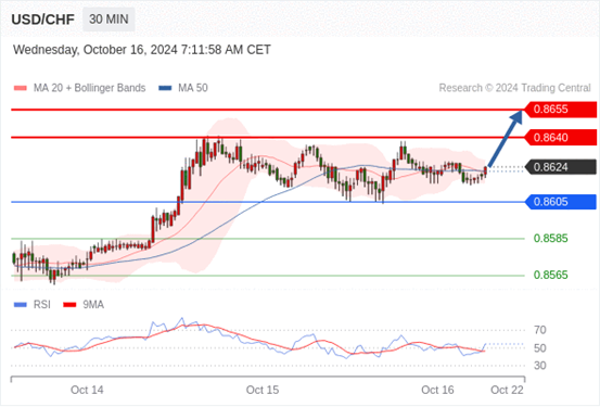 在 0.8605 之上,看涨,目标价位为 0.8640 ,然后为 0.8655 。