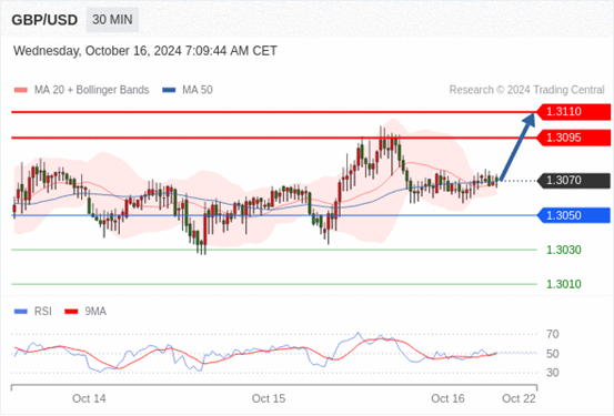 在 1.3050 之上,看涨,目标价位为 1.3095 ,然后为 1.3110 。