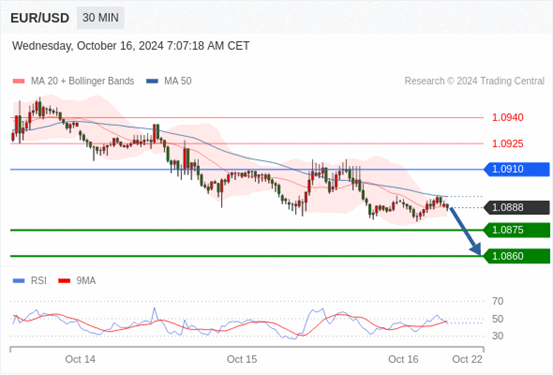欧元/美元 当日内: 短期关键阻力位在1.0910。