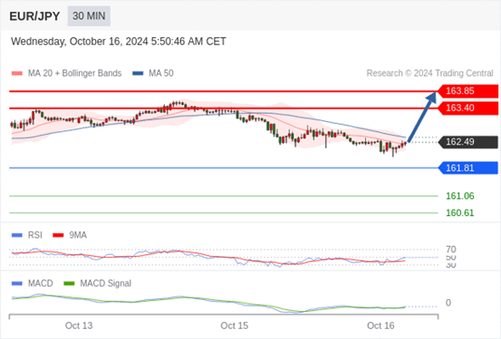欧元/日元 当日内: 有上涨的可能,目标价位定在 163.85 。