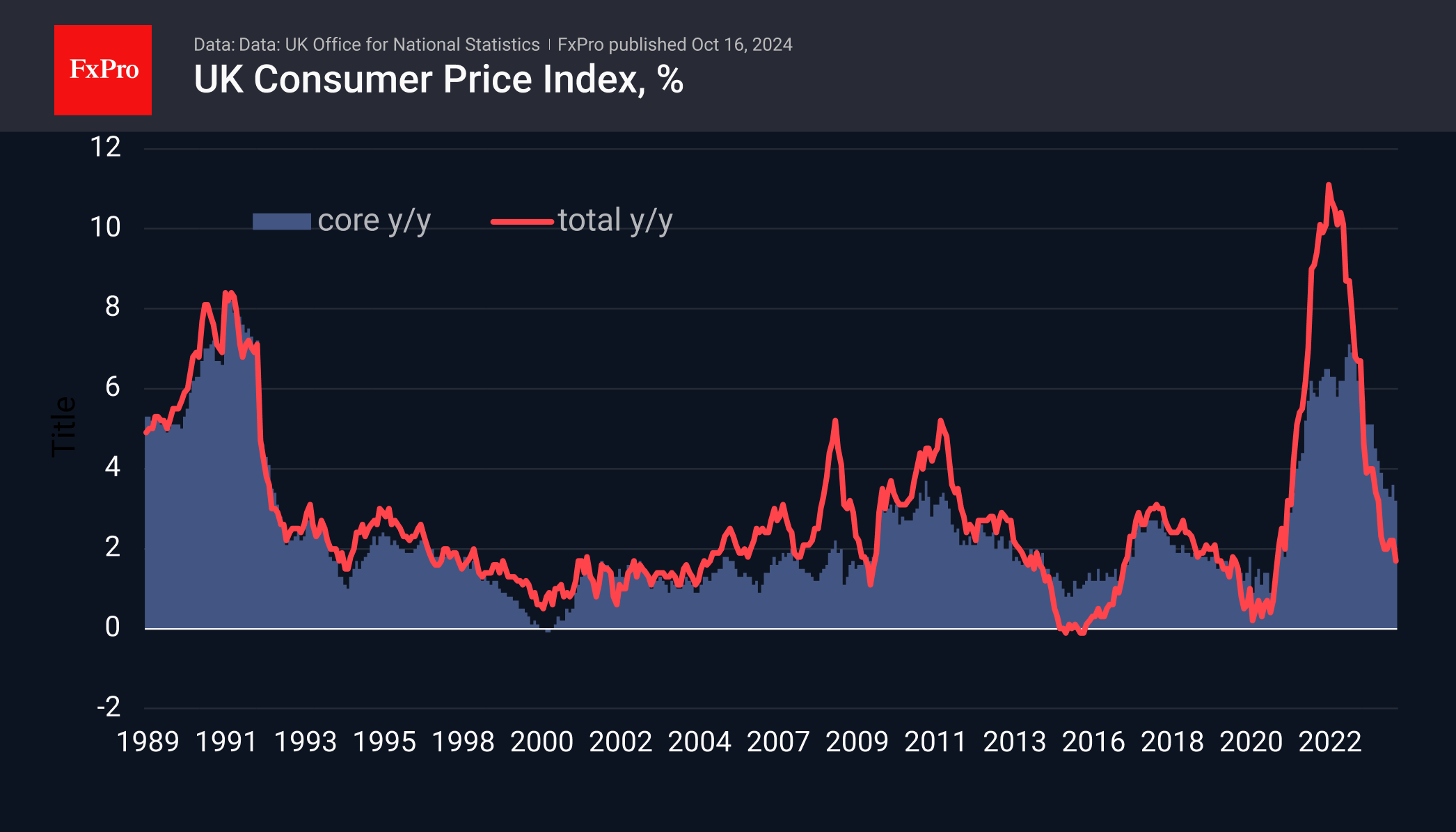 9月消费者物价指数(CPI)变动不大,同比涨幅从之前的2.2%降至1.7%,预期为1.9%,为2021年4月以来的最低增速。物价涨幅低于英格兰银行2%的目标,这使得政策宽松得以加速以刺激经济。上个月的核心消费者物价指数较上年同期上涨3.2%,低于8月的3.6%,为2021年9月以来的最低水平。
