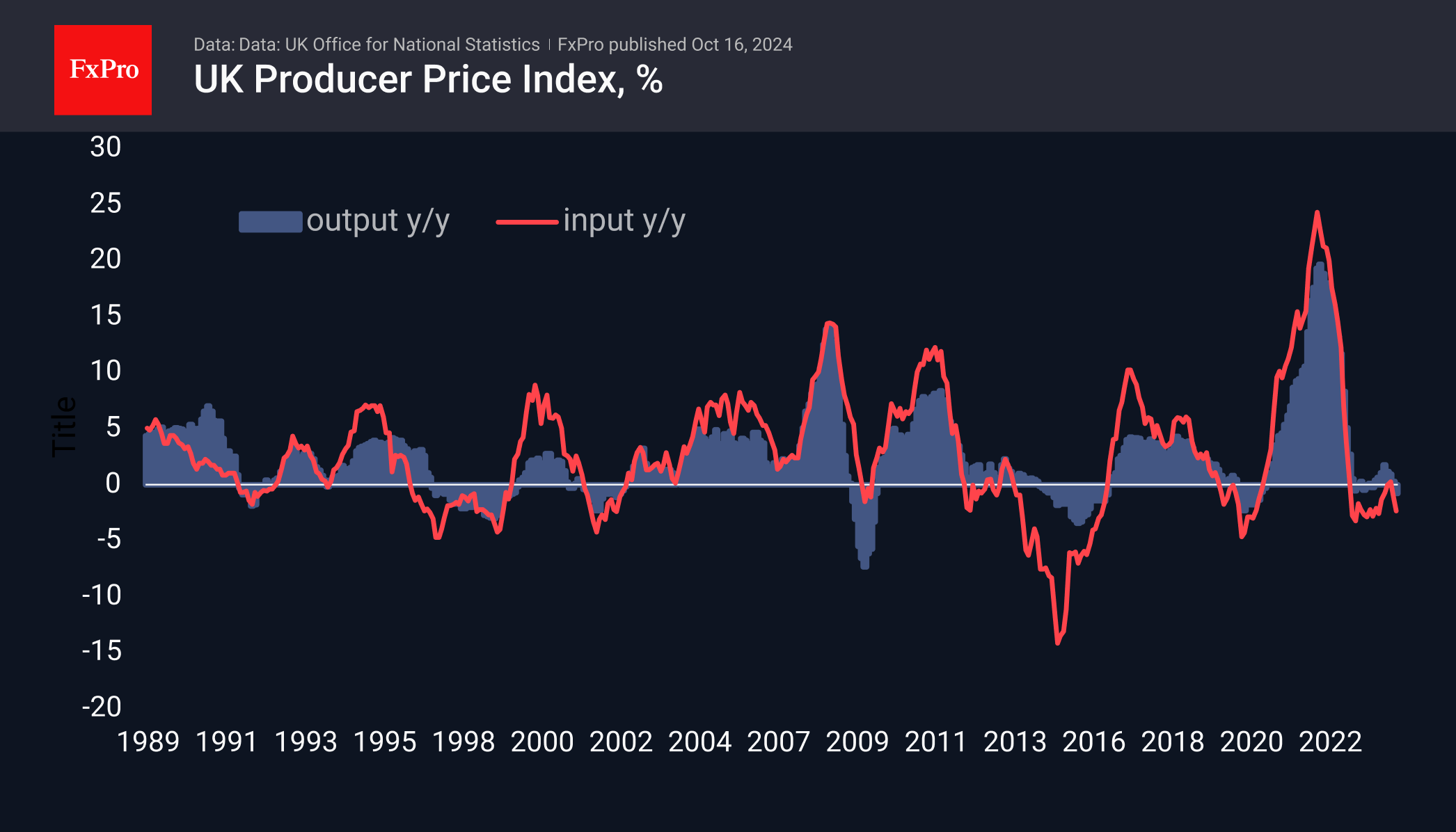 英镑面临的另一个看跌因素是生产者价格下跌加速。投入生产者物价指数(Input Producer Price Index)在连续五个月分别下跌2.5%和过去一年累计下跌2.3%之后,本月又下跌了1%。产出生产者物价指数(output PPI)继此前下跌0.4%之后,9月份下跌了0.5%,使得年趋势重新回到 -0.7%的负值区间。在这两种情况下,相关数据均远低于平均预期。
