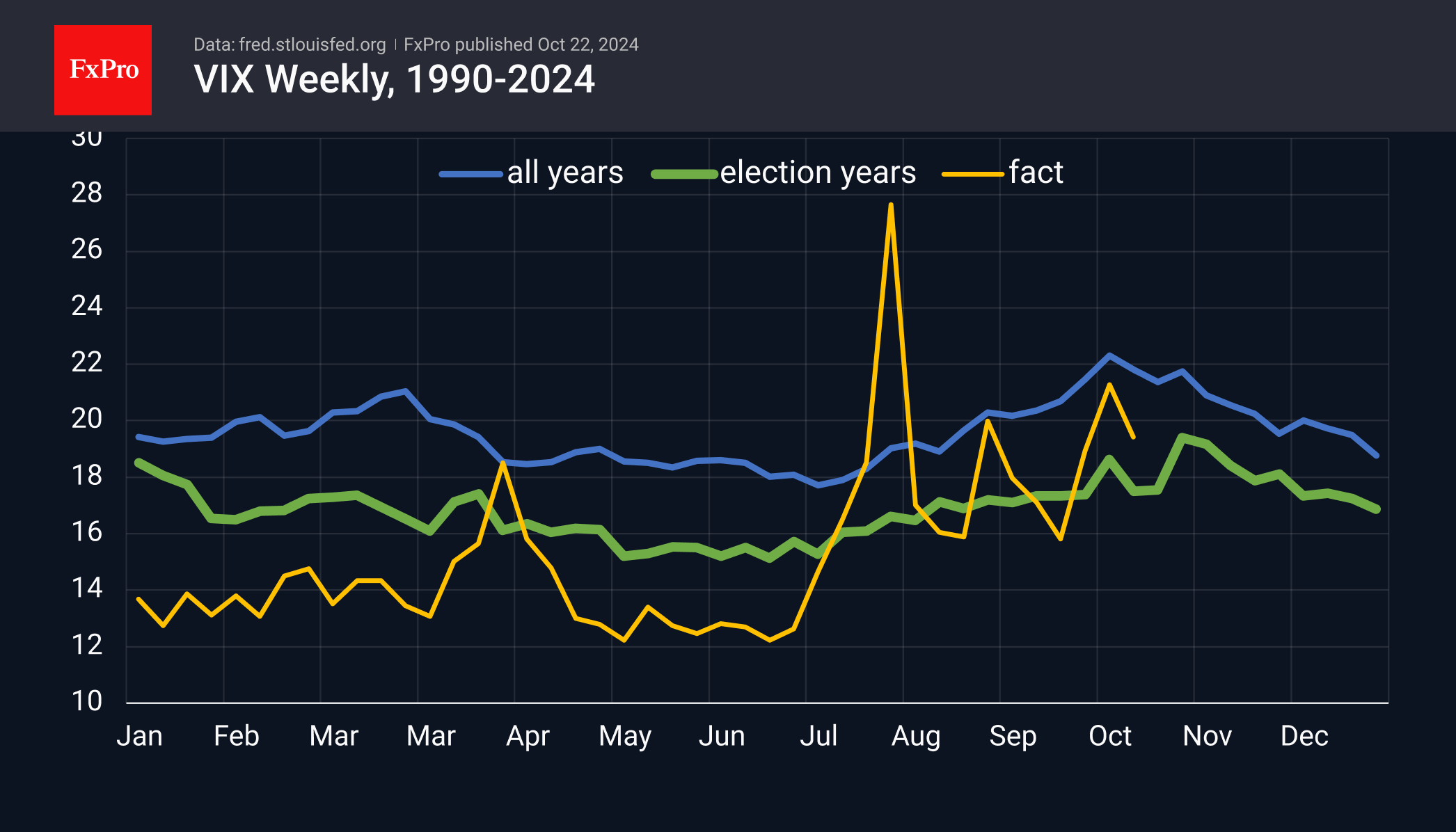 10月初,VIX(恐慌指数)波动率指数升至20以上,这表明市场恐慌情绪加剧,在历史高点被系统性刷新的情况下,这种情况不同寻常。然而,从历史数据来看,当前的指数水平低于一年中这个时候的典型水平,尽管比美国总统选举年的水平略高。